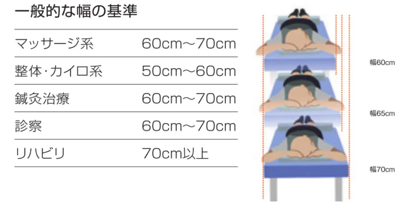 ベッドの幅が広いとリラックス効果や安心感が高まります。 ただし、幅が広すぎると施術者から患者様の反対側に手が届きにくくなり、施術時の体勢に負荷がかかってしまう場合があります。 一般的には60㎝~70cm幅が多いですが、院内の広さなどを考慮し、適切な幅を選びましょう。 うつ伏せメイン、仰向けメインなど、施術方法により幅のサイズが変わります。 特に腕の置き方によって幅が決まる事が多いです。 体位変換する場合は、幅を広めにとっておく方が安心です。 設置する場所を考慮し、テーブルなどでシュミレーションしてみるのが確実です。