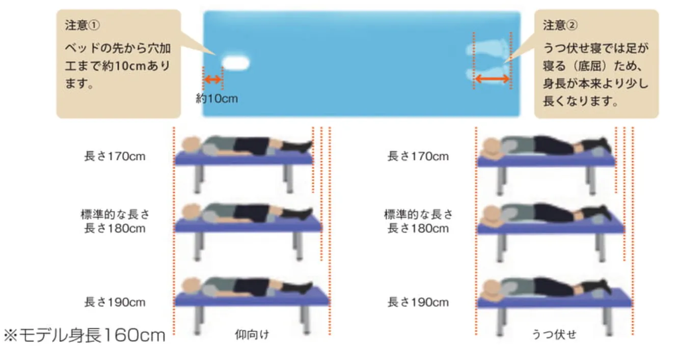 院内の広さを考慮して長さを選びます。 平台の長さは170㎝、180㎝が一般的ですが、スポーツ向けの医院などでは大きめのサイズや特注サイズを選ばれる事もあります。 長さ180cmのベッドで身長170cmの人が仰向けで寝た場合は余裕がありますが、うつ伏せではちょうど良い大きさとなります。 一番端に頭を置かないので、マクラの位置を考えて選びましょう。 設置する場所を考慮し、テーブルなどでシュミレーションしてみるのが確実です。