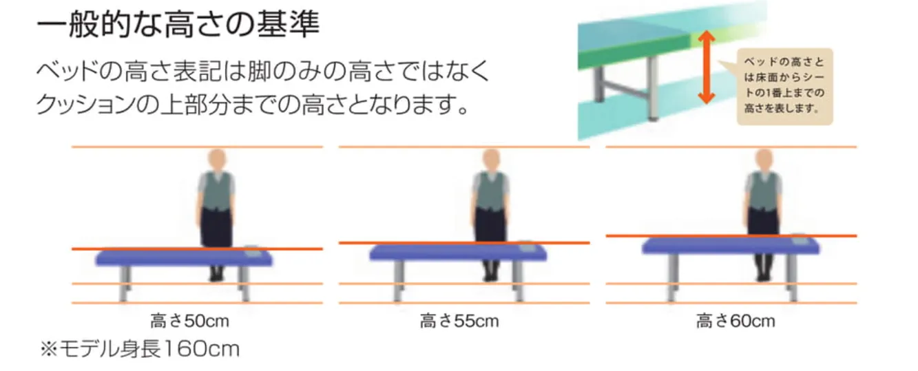 施術者が施術し易い高さを選ぶ事が重要ですが、 選ぶ高さの基準は施術者の身長、患者様の体の厚みによっても変わってきます。 標準的な高さは50㎝ですが、主となる施術内容によっても変わってきます。 施術方法が多い場合や施術スタッフが多い場合などは電動で高さ調整可能な電動昇降ベッドもおすすめです。 参考までに思ったより高さが高かったという理由でサイズ交換対応される事があります。 人の体の厚み、マクラやクッションの厚みも考慮しましょう。 テーブルなどでシュミレーションしてみるのが確実です。