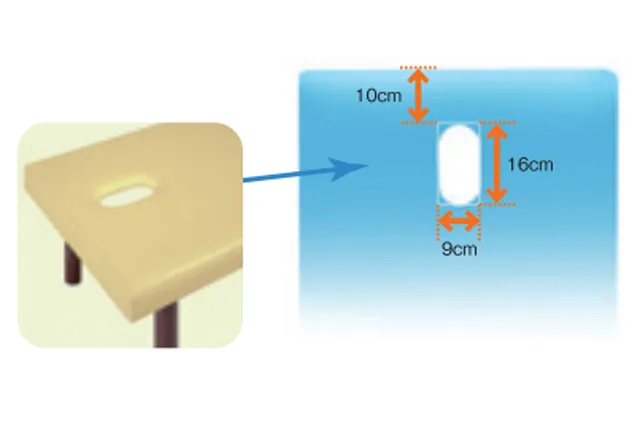 有孔加工とはうつ伏せの時に呼吸を楽にする為の加工です。 有孔加工にそのままお顔を当てて寝るよりも、お顔への圧迫を軽減する為に、マクラやフェイスタオルをご利用ください。