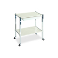 取り外しが可能な衛生的なトレー付きメディカル用スチールワゴン。棚部分は環境にやさしい粉体塗装。支柱は衛生的なクロムメッキ加工。直径4cmの単輪キャスター。定番の2段式ワゴン。幅55cm、奥行36cm、高さ70cm