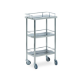 医療用として衛生的に使用できる錆びにくいステンレス素材のワゴン。直径7.5cmの単輪キャスター付き。最上部に落下を防止する柵付き。幅45cm、奥行30cm、高さ85cm