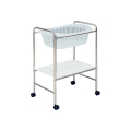 直径4cmの双輪キャスター付き。簡易なレザー棚を装備した2段式。衝撃強度に優れ水分や薬品にも強く丸洗い可能なプラスチックカゴ。幅52.5cm、奥行37cm、高さ75.5cm