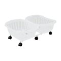 直径4cmの双輪キャスター付き。2個のカゴを連結した業務用仕様。衝撃強度に優れ水分や薬品にも強く丸洗い可能なプラスチックカゴ。幅75cm、奥行52cm、高さ25.5cm